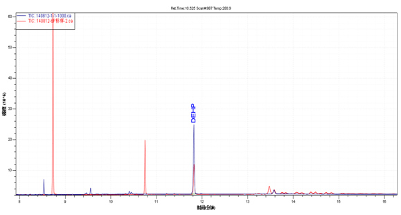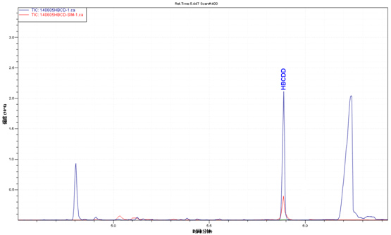 产品的样品TIC图(蓝颜色)与六溴环第十二烷规范标准品TIC图(紫色)
