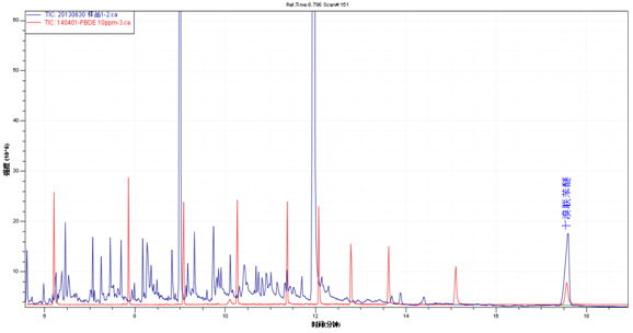 试样TIC图(绿色)与多溴联苯醚混标TIC图(暗红色)