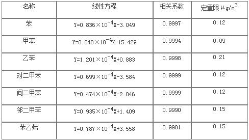 表6 7种苯系物组分的线性规模、线性方程、相干系数和体例的定量限