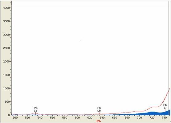 下面实谱表达纯铜rc101(Pb,0ppm)即本底、紫色虚谱为 镍白铜313(Pb:60ppm)