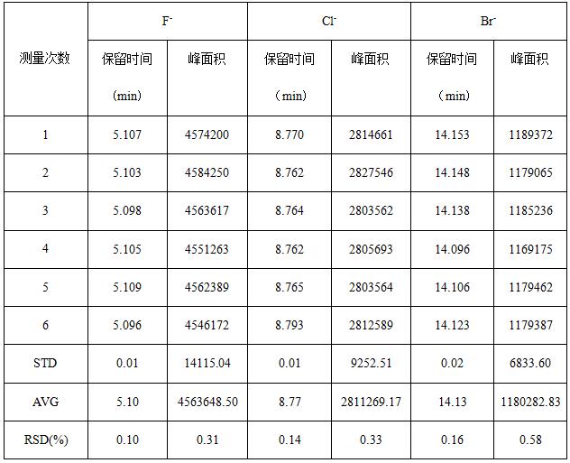 取2.0µg/mL F-、Cl-、Br-夹杂规范规范溶液反复进样6次,考查保留时候和峰面积的反复性,详见图4;此中保留时候(tR)绝对误差在0.10%-0.16%之间,峰面积(S)的绝对规范误差在0.38%~0.53%之间,反复性成果详见表1。