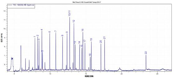 1—α-六(liu)(liu)(liu)六(liu)(liu)(liu)六(liu)(liu)(liu);2—β-六(liu)(liu)(liu)六(liu)(liu)(liu)六(liu)(liu)(liu);3—γ -六(liu)(liu)(liu)六(liu)(liu)(liu)六(liu)(liu)(liu);4—蒽(en)-D10(内(nei)标);5—δ-六(liu)(liu)(liu)六(liu)(liu)(liu)六(liu)(liu)(ꦯliu);6—七氯;7—艾氏(shi)剂(ji);8—环(huan)氧(yang)七氯 B;9—γ-氯丹(dan);;10—硫丹(dan) I;11—α-氯丹(dan);12—4,4'-DDE;13—狄氏(shi)剂(ji); 14—异狄氏(sh🐭i)剂(ji);15—硫丹(dan) II;16—4,4'- DDD; 17—异狄氏(shi)醛;18—硫丹(dan)硫酸酯(zhi);19— 4,4'-DDT;20—异狄氏(shi)酮; 21—甲(jia)氧(yang) DDT;22—苝(pei)-D12(采样替换(huan)物)